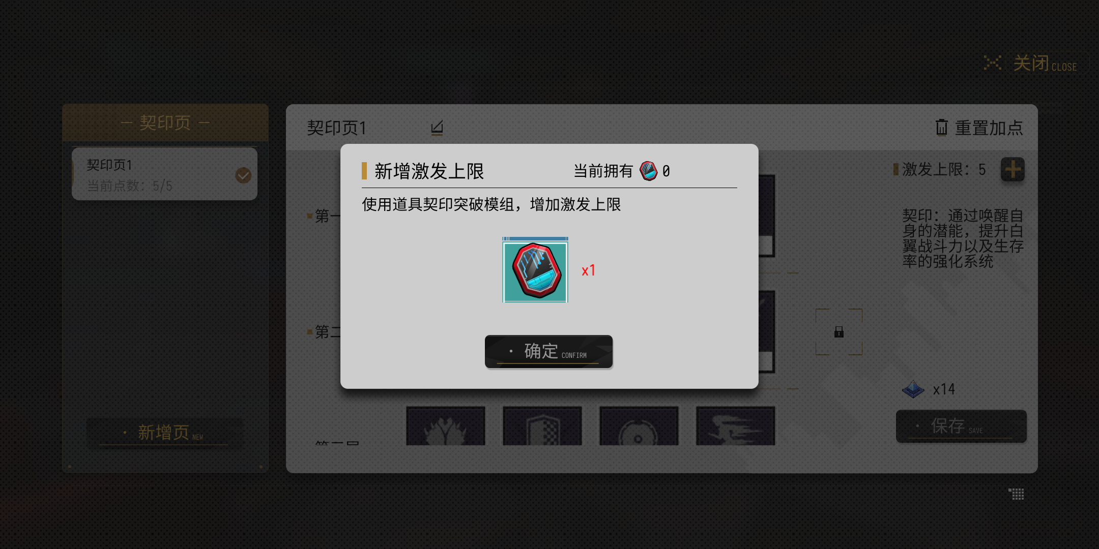 没开启一层都需要契印链接矩阵这件道具,每次加点之后也需要消耗契印激发棱镜,总而言之契印还是需要慢慢培养的一个东西,另外契印还可以激发上限,需要的道具是契印突破模组。