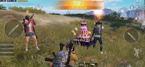 刺激战场吃鸡后会提示你成功,而在和平精英中吃鸡不叫吃鸡,叫冠军,冠军队伍出现一个大的生日蛋糕,满满的正能量。
