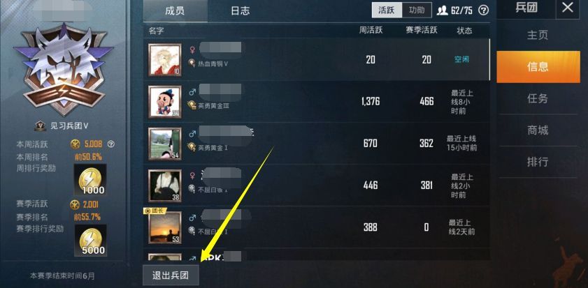 2.进入兵团后,点宾团中的信息,然后就可以最下面的有个退出兵团的按钮,这个是就可以点击兵团。