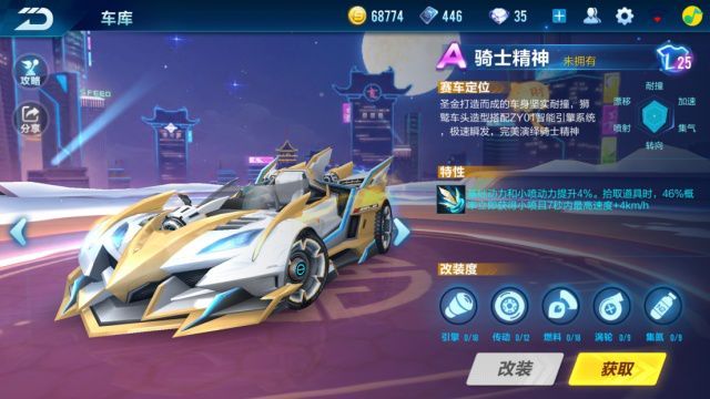 骑士精神:基础动力和小喷动力提升4%。拾取道具时,46%概率立即获得小喷且7秒内最高速度+4km/h