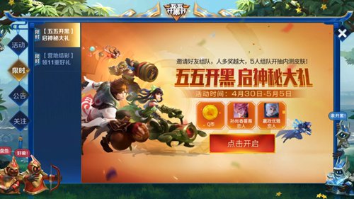 王者荣耀开黑节将在5月5日正式开启,但开黑节活动却已经提前上线,本届开黑节主要是六大活动,分别是:永久皮肤免费拿、永久内测皮肤免费抽、头像框与特效体验卡免费领、开黑失败不掉星、裴擒虎梅西皮肤返场、开黑节专属皮肤上线。
