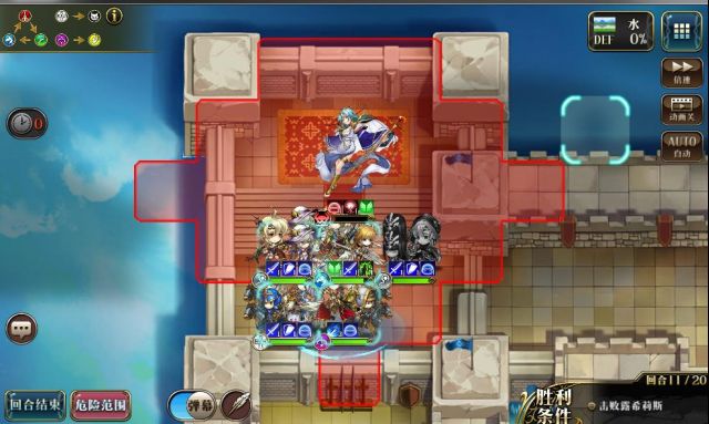 由于回合充足,我们先在女神危险区外集合等一下技能CD。6回合的时候,奶骑先套神迹。7回合奶骑给拉娜进击,拉娜暗镰雷丁,之后利昂进去骑精、突击,封住雷丁回血。我方雷丁在外面开神卫,护卫住。下回合打掉雷丁开始输出女神。
