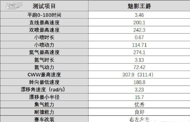 如果说火神性能跟白玉半斤八两不相上下(在团子看来火神略胜),那么团子可以毫不犹豫的告诉你,魅影王爵性能几乎全面超越白玉。最高速度略胜一筹,氮气时间略胜,小喷时间略差(够用),但小喷动力和氮气动力都胜于白玉。再者,魅影王爵的漂移性能要大幅度优于白玉,通过漂移角速度3.23 rad/s可以看出,魅影王爵的漂移性能是跟烈魂同一水平的,优于白玉的3.14 rad/s.
