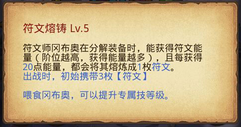 符文师是本次更新中唯一的魔法系冈布奥,技能是分解装备可以获得【符文】。