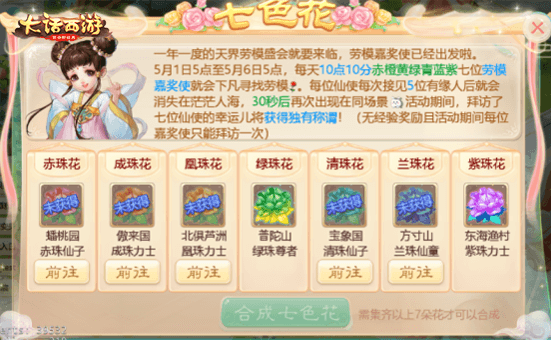 5月1日-5月6日期间“七色花”活动也将在游戏内上线,等级≥35级的玩家可以参与该玩法。活动期间,每天10点10分赤橙黄绿青蓝紫七位劳模嘉奖使就会下凡寻找劳模,每位仙使每次接见5位有缘人后就会消失在茫茫人海, 30秒后再次出现在同场景,有幸拜访了七位仙使的幸运儿将获得专属独有称谓!活动期间每位嘉奖使只能拜访一次,请三界侠士们把握时机,第一时间前往仙使处领取嘉奖!