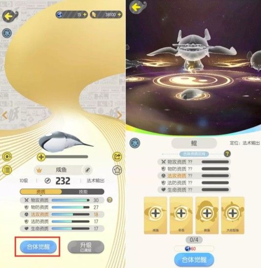 5、合体觉醒目标妖灵的每种资质将会以合体妖灵的相应资质的最低与最高值为区间随机生成。同时,所有合体妖灵的该种资质的平均值越高,目标妖灵的相应资质水平就会更高哦!例如,如果是四只均为32的鱼合体进阶,那合体后鲲的各项属性也一定均为32。