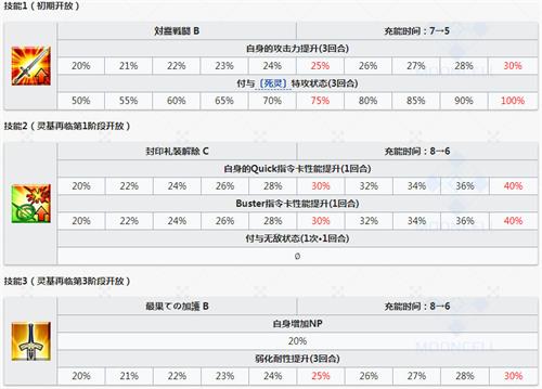 三技能自身NP增加20%,弱化耐性提升20%~30%三回合。