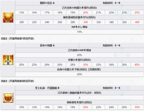 技能介绍:司马懿的一技能为己方全体防御力提升15%~25%三回合,赋予被伤害减免200~400状态三回合,NP增加10%。