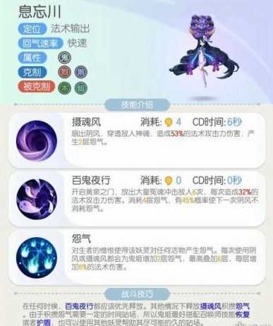 作为游戏中首个出场的鬼系法术输出妖灵,息忘川的法术伤害能力非常的强,缺点在技能冷却时间太长和消耗太大,所以推荐配合一些辅助妖灵来做到一波流的效果。