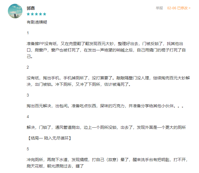 “耗时长达2天,投资0亿的3A大作”——《厕锁》,TAPTAP评分9.2。“玩家”上完厕所发现忘记带纸,要通过各种选择使自己成功逃出厕所,但是途中你会遭遇各种不同的死法,选项和结局都让人意想不到。