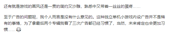 而且,虽然因为广告影响游戏体验,玩家不可避免地会有抵触情绪,但是凭借着沙雕游戏自身的独特乐趣和价值,相比其他休闲游戏,玩家对沙雕游戏内的广告有更高的接受度。