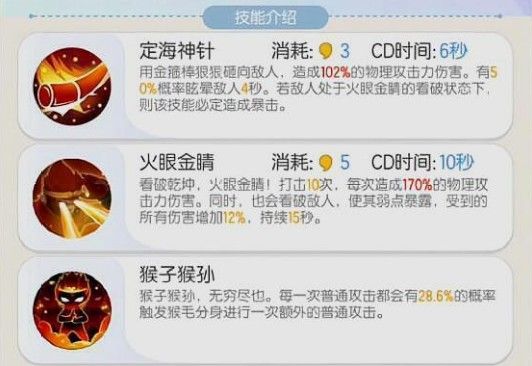 齐天大圣能召唤猴子猴孙,这算是一种普攻的方式,能给敌人带来非常广泛的伤害,一技能会给对方造成102%的伤害,同时在火眼金睛的辅助下,有50%的几率能让对方一段时间眩晕。