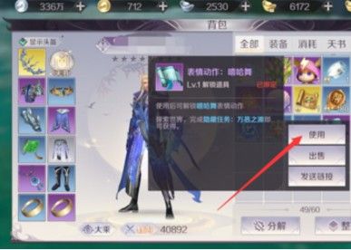 打开背包点击获得的嘻哈舞动作,弹出的选项点击使用,这样就可以解锁动作了。
