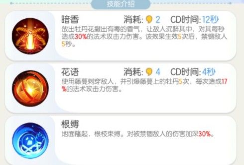 分析:三阶技能根缚对被禁锢的敌人造成伤害,暗香回复时间长,可搭配有禁锢效果的蛙护法等,让根缚可以发挥到其作用。