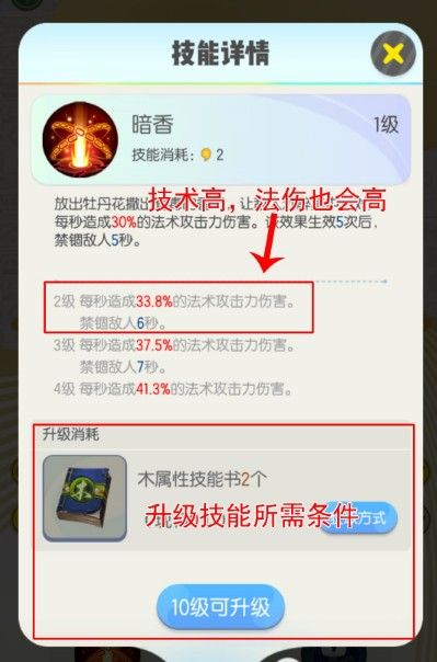 在妖灵的主界面上的技能处,三个技能都能升级,不过需要达到级别限制和拥有技能书才能升级。升级后的技能都会让技能伤害等方面提高,如香玉的暗香技能2级时,能造成33.8%法伤,禁锢敌人6秒。想要香玉变更强,御灵师要多多升级技能哦!