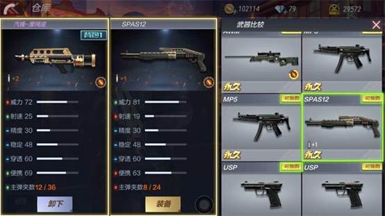 如图,汽锤-摩羯座和SPAS12相比,前者威力低于后者,射速、便携、主弹夹数高于后者,其他数据保持一致,即:论输出伤害,后者占优;论续航时间和压制性,前者占优。
