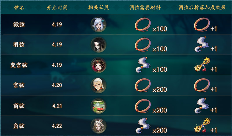 4月19日更新后,日常活动副本也已正式登场!降妖师们通过解锁七根待调整的琴弦,来开启相应的日常副本。而相应的调弦道具则需要在活动坊市中购买,当降妖师们完成调弦后,还能够获得金缠纱、银马鬃等活动材料额外的掉落加成的道具。