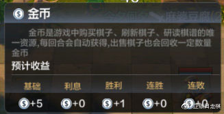 回合收入:回合基础收入+利息收入+连胜奖励/连败补偿 组成了你每回合能够获得的金币。利息收入即你结束回合时的金币的10%。利息收入最高为5,所以当你的金币囤积超过50后,尽量把这些富余的金币转化为你的棋子
