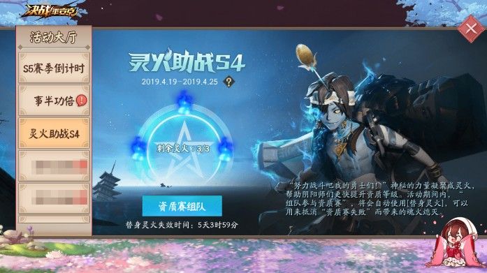 另一方面,“灵火助阵”活动也将在4月19日至4月25日期间同步开启。大人们可在活动界面领取3颗“替身灵火”,在活动期间内都可以使用灵火组队参与资质赛。在组队参与资质赛时,“替身灵火”将帮助阴阳大允以下的阴阳师抵挡一次资质赛的魂火熄灭。需要注意的是,在晋级赛与保级赛的时候将无法使用,而触发福神降临后则不会消耗灵火。