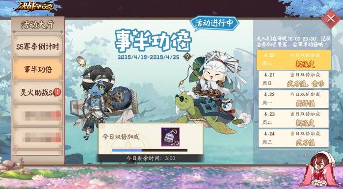 4月19日至4月25日期间,每晚18点到23点,阴阳师大人们在线均可自动获取“事半功倍”活动的双倍加成效果,包括金币双倍、羁绊值双倍、武力值双倍、式神熟练度双倍。同一天有两种加成效果时则同时生效。在获取加成效果之后,大人们在接下来进行的三场资质赛中,都将获得当天对应的双倍加成。除了武力值双倍加成需要“战斗胜利”条件,其余加成效果无论输赢都可生效!