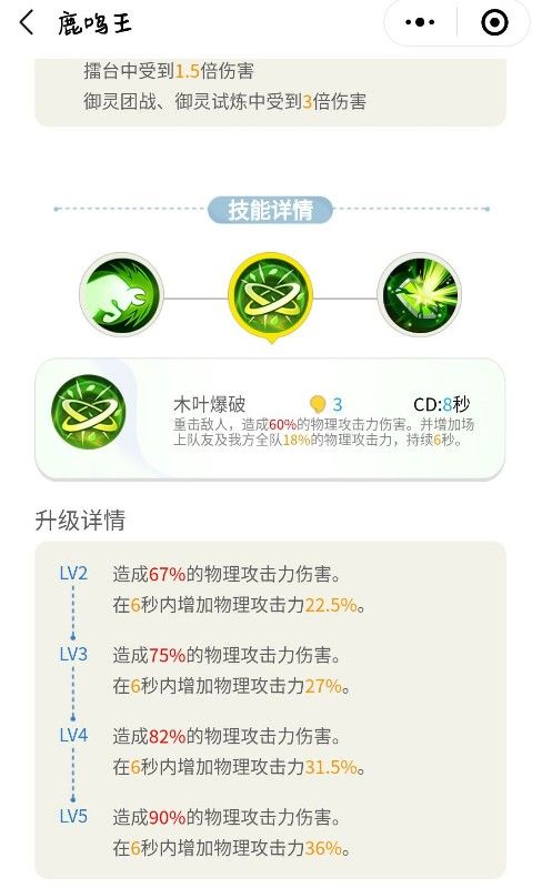 虽然书中仙是万金油,但是单论物攻方面加成还是鹿鸣王首屈一指,不仅6秒内增伤36%,还有被动技能 普攻一次降低对手物抗5%的效果,上限叠加5层持续12秒。