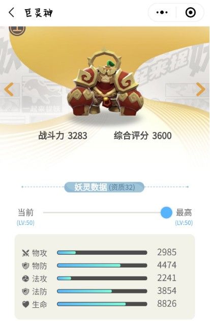 必练神宠之一,海灯使。消耗资源,少量,性价比最高,稀有度可遇不可求。第二个推荐的是巨灵神,所谓活着才有输出,任何战斗死了都是没意义的,先看面板: