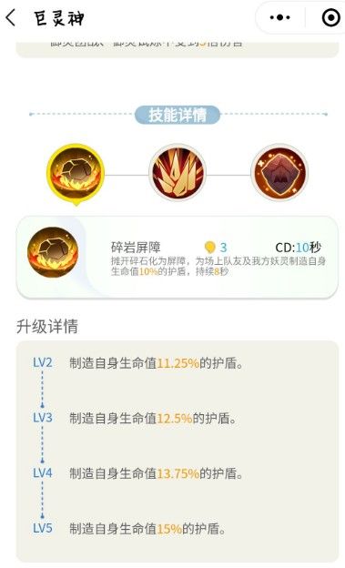 巨灵神专属神技,群体套盾,自体10%-15%血量护盾,而在组队战中,通常1辅助2输出最为合理,而辅助可以是增伤辅助,功能辅助,也可以是抗伤辅助。而输出越高的妖,身板就越脆,普遍5k到6.5k的血量,并且双抗很低。 坦克妖怪给自己套1500的盾可能没什么感觉,但如果这1500的盾套给脆皮输出的身上,那就很恐怖了。但是玩辅助,一定要意识好,什么时候给盾,给盾一定要及时,时机需要把握。(例如队友快死亡切巨灵神套个盾,再切辅助回血)