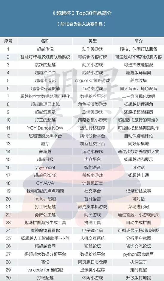 小王的感慨并不夸张,超越杯的硬核,从初赛中top30名的项目名称及类型便可管中窥豹。游戏软件两大类别中,游戏占了12款,各类型软件占了18款。软件类目比较中规中矩,无外乎社交平台、数据分析平台等实用类软件。相比之下,游戏内容有点让人出乎意料。除了益智类、休闲类小游戏外,杨超越粉丝还贡献了RPG(角色扮演)、ACT(动作游戏)等需要耗费大量人力物力的大型游戏,其中不乏几款质量优秀的游戏。