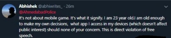 互联网自由基金会的律师告诉印度当地媒体,执法机构实施的禁令是违反印度宪法的。人们有权选择他们的娱乐活动,没有具体的证据证明游戏会导致年轻人的暴力行为。他还表示,警方在禁令发布后逮捕的行为违反了宪法规定的基本权利,因为CrPC(刑事诉讼法)的第144条并没有授权当局强制禁止玩游戏。