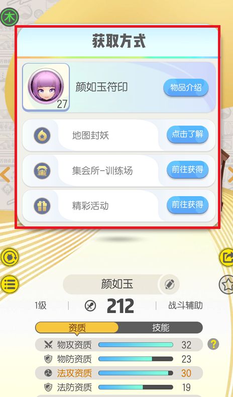 进入到颜如玉升级界面,我们知道了这只妖灵的升级除了要使用金币还要使用【颜如玉符印】。我们点击屏幕最上方的符印查看怎么获得符印。现在我们得知这些符印可以通过抓捕颜如玉的过程以及放生颜如玉时获得。