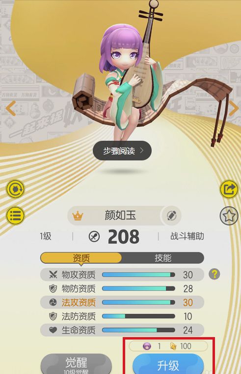 我们再一次来到颜如玉的升级界面,点击【升级】,把她先升到10级。(每一次升级消耗1个符印以及一定数量的金币)