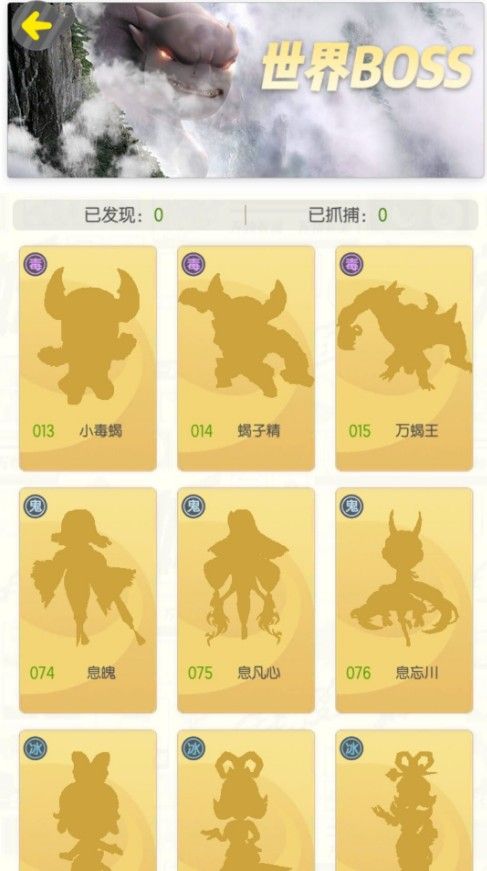 世界BOSS图集一共有10只妖灵,但是我们可以分为(万蝎王)(息忘川)(蛇娘娘)(捉妖记血妖)四类,因为(万蝎王)(息忘川)(蛇娘娘)是一个系列的觉醒妖灵,每一种有三个妖灵。