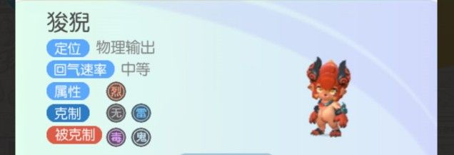 狻猊的属性为烈,它克制:属性无,属性雷,被克制:属性毒,属性鬼。狻猊的属性烈,被克制的妖灵属性是毒和鬼,而这些属性妖灵常见在擂台上,擂台上的妖灵是单个BOSS,所以利用狻猊去作战时,可搭配其他克制属性毒、鬼的妖灵,让己方的战力增加,可以快速击杀擂台上的BOSS,攻下擂台。
