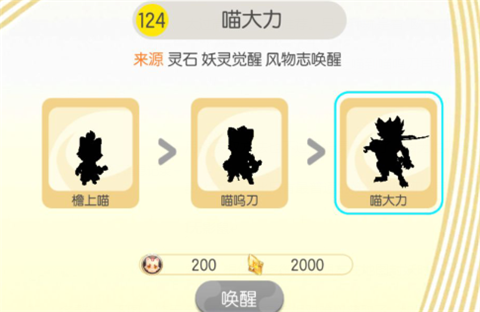 这二位都是金属性妖灵。喵大力可以通过花费200喵呜符印+2000灵石的代价进行唤醒,但是考虑到这种代价太过高昂,并不推荐。另一种就是看"欧气"的灵石唤醒模式。最后当然也可以选择最笨但也最有效的妖灵唤醒,从檐上喵到喵呜刀再到喵大力一步步培养而来。