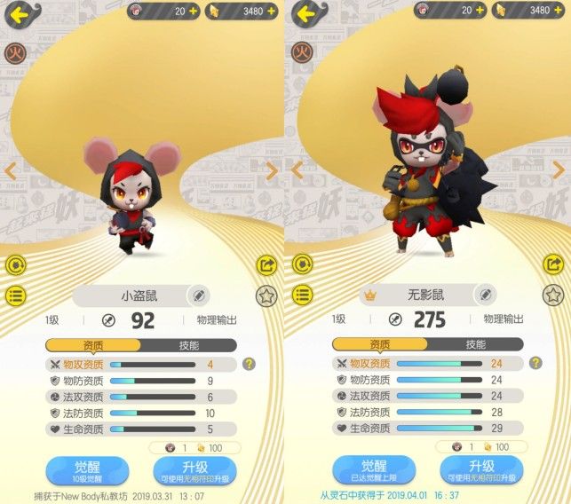 首先,我们先来看俩个同系列的妖灵,谁的评分最高!因为评分高的妖灵才有培养的必要,否则只会是浪费云纹和符印,再者就是看资质!(小盗鼠)系列的妖灵,是以物理输出为主,而哪个物理输出资质高,那个妖灵培养起来才指的!而大家不要担心前期对某一个系列的某只妖灵投入大量资源而感到浪费,当我们遇见更好的,我们可以将之前的妖灵进行放生,符文和云纹会按一定比例返还我们,有舍才有得!只有我们舍得,我们才能得到最强的战力!