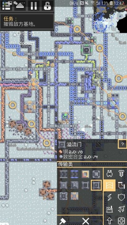 开始先找一些物资之类的,尽量多采一些铜矿,可以多放一些铜矿钻头,前期多努力发展铜矿,最好是铜出现用不完的情况。只有在铜够用的情况下,才能用更多武器来对抗敌人,在基地的周围放几圈双管炮塔,保护住自己这边的基地不被敌人入侵。游戏界面出现红色字体提示时,这就表示有敌人来攻击了,一定要赶紧回到基地把敌人赶走。