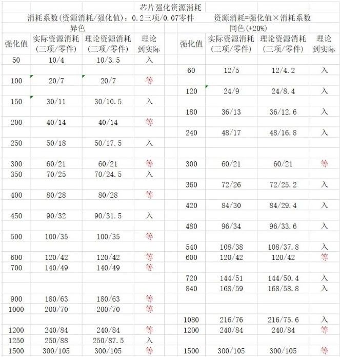那么理论资源消耗量=强化值×消耗系数:三项=强化值×0.2,零件=强化值×0.07。