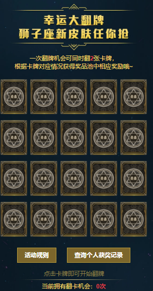 1.活动概述:幸运大翻牌,达摩黄金狮子座皮肤任你抢。