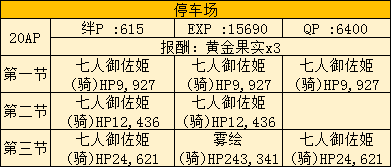 完成停车场需要AP20的消耗,至于通关奖励,也都是大家意料之中的奖励,分别是615的羁绊、1560的EXP、6400的QP,最后再加上5个黄金果实。