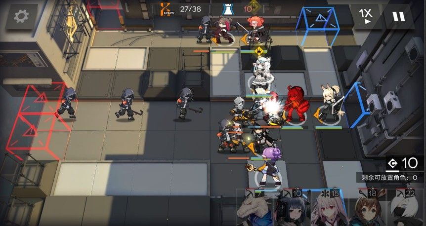 然后根据敌方的配置调整下场的干员,最终形成图示结构的防御阵地。