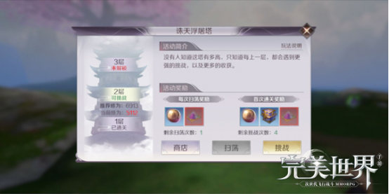 完美世界手游当玩家等级达到27级的时候,就会开放诛天浮屠塔。诛天浮屠塔为单人闯关活动,每上一层遇到的挑战会更强,收获也会越多。每一层首次通关都会获得小型浮屠珠、上品镌刻宝箱以及聚元微粒。已经通关的楼层不能再次挑战,凌晨4点会重置。