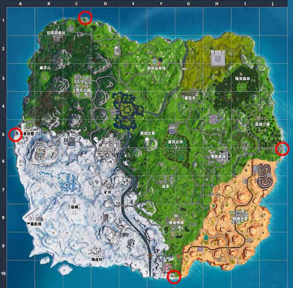 下图中有详细标注每一个位置的地点,大家可以根据坐标前往目的地,最北端和最西端距离比较近,大家可以优先前往这两个地方,或者是先去最东端和最南端,这两个地方离得也不远,那一边方便大家就可以选择从那一端开始。
