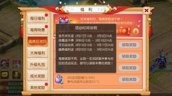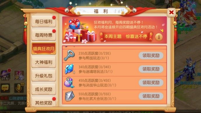 本周盛典狂欢月主题为“惊喜送不停”。玩家只要在3月6日~3月10日期间,分别累积125、230、340、450、550点活跃度,并参加海底寻宝、帮战、迷魂塔、决战华山、比武大会等夜间玩法,即可获取星辰碎片、银钥匙、吉祥锦囊、星辰晶石等好礼!