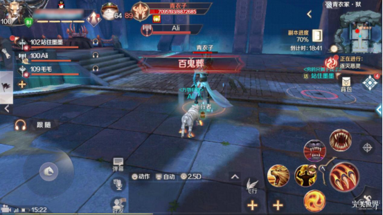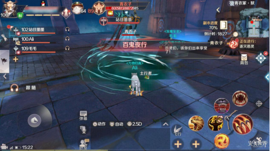 百鬼夜行则是青衣子在附近召唤一群小鬼,小鬼会对我们发起进攻。在青衣子释放此技能时,妖兽使用风火轮对青衣子发起进攻,即可吸引小鬼的仇恨。小鬼比较脆,比较容易消灭。