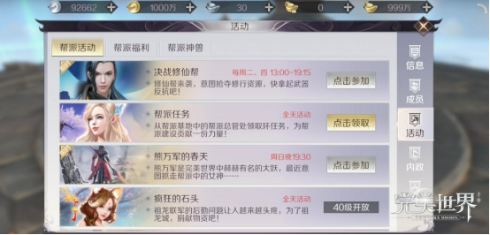 帮派的作用除了能够认识到许多厉害的修真者,最大的作用就是解锁更多的活动了,这样各位修真者每天都能获得更多的银币和经验,以及帮贡等特殊奖励,实力也会迅速提升。一般的帮派任务完成难度并不大,比如帮派的环任务大体以搜寻道具或者击杀野外小怪为主,在挂机的情况下就能轻松搞定。