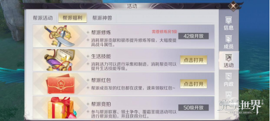 各位修真者加入帮派后,能获得制造各种药品的帮贡,这样组队打副本的时候就会更加容易了。随着等级的不断提升,各位修真者能够体验的帮派玩法也越来越多,比如帮派修炼养成系统42级开放,是各位修真者提升战斗实力的大好机会。