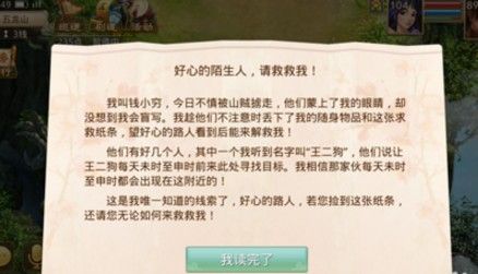 进入游戏之后要去李捕头这里领取任务,领到本周的探案任务才能开启接下来的一系列玩法。这次的任务是需要找到失踪人口钱小穷,根据钱大富的描述,得知去爬过山,那么接下来就去爬的那座山周围寻找线索,这座山就是五龙山,在五龙山这里看到金系掌门的周围,有一个钱袋,而且钱袋上还有补丁,一看就知道是钱小穷的,钱袋里面有纸条线索,是钱小穷的求救信,在信中得知王二狗每日未时和申时都会来到这里寻找目标,只要在每天的下午一点到五点来五龙山,就能找到王二狗,这是一条非常重要的线索。