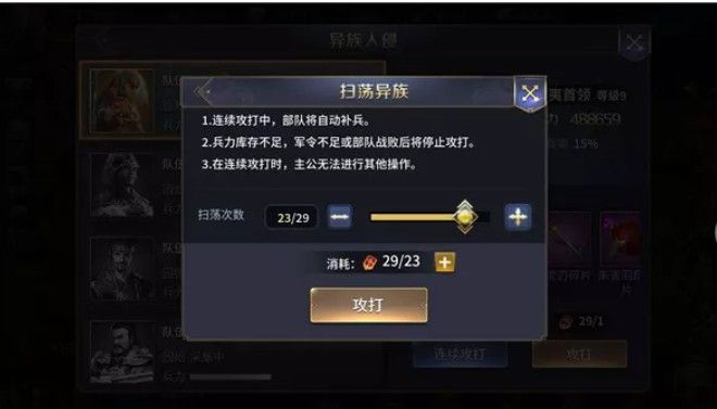 讨伐异族需要消耗行军令,每次讨伐消耗1点行军令,当行军令为0时则无法派兵,需等待行军令恢复或黄金购买行军令后,才可继续讨伐