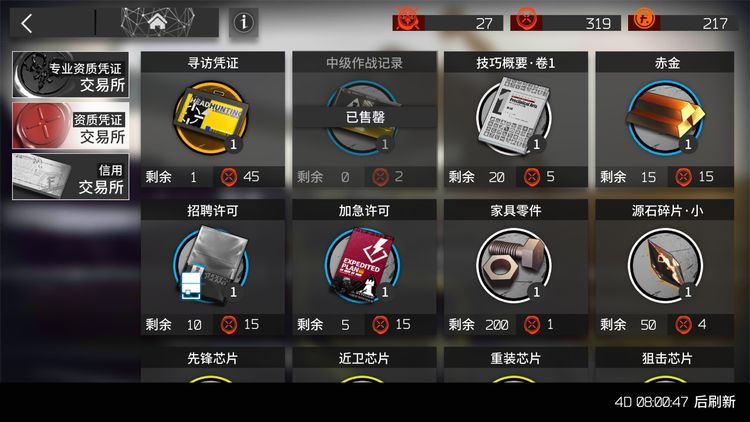 采购中心是游戏里的物资购买设施,商店内内容定期刷新,且可使用多种货币进行交易。不同的商店使用不同的货币进行交易。商店会定期刷新,发现心仪的商品记得及时购买。游戏中还存在一种特殊的商品,可以被购买多次且每次商品和售价都会发生变化。