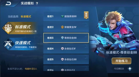 实战模拟分为快速/标准两种游戏模式,共有10种不同的难度,召唤师们可以根据自身的能力与挑战目标任意选择。
